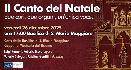 | Le celebrazioni musicali del tempo di Natale tornano a illuminare la città con un evento di grande suggestione: il Concerto “Il canto di Natale: due cori, due organi, un’unica voce” che avrà luogo il 26 dicembre alle ore 17.00 nella Basilica di Santa Maria Maggiore e sarà replicato il 10 gennaio alle ore 21.00 presso il Duomo. Protagonisti della serata saranno il Coro della Basilica di S. M. Maggiore, diretto da Cristian Gentilini con Roberto Mucci all’organo, e la Cappella Musicale del Duomo, diretta da Valerio Calegari con Luigi Panzeri all’organo. Il programma propone un percorso musicale ricco e variegato: dalle elaborazioni dei Tre canti natalizi di Jan Novák ai brani di Distler e Mendelssohn, passando attraverso pagine di Rheinberger, Kodály e De Victoria, fino a una composizione originale di Valerio Calegari. Il concerto culminerà con l’esecuzione a cori uniti e doppio organo di alcuni classici intramontabili del Natale – Tu scendi dalle stelle, Venite Fedeli, Astro del ciel – in speciali arrangiamenti firmati da don Valentino Donella, don Gilberto Sessantini e Cristian Gentilini. | |